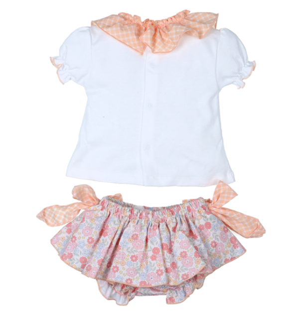 Conjunto bebé niña con falda floral y blusa cuello vichy naranja