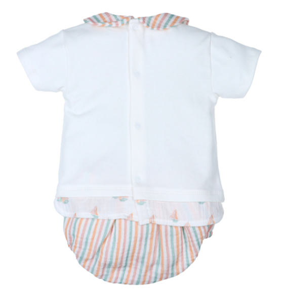 Este conjunto para bebé niño es perfecto para los días de verano, combinando frescura y estilo. Incluye camiseta blanca con bordado de velero y cuello a rayas, junto a cubrepañal a juego en tonos pastel. Diseñado para brindar comodidad y un look marinero encantador, es ideal para paseos, eventos o como regalo especial.
