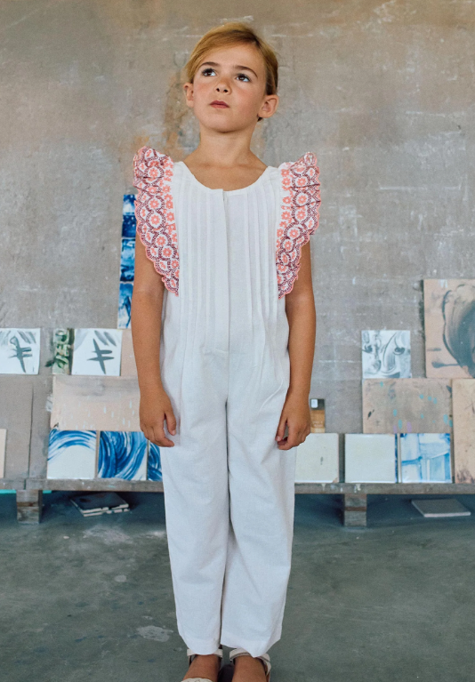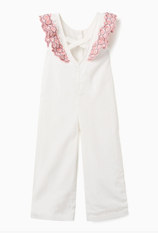 Este mono blanco combina comodidad y elegancia para el día a día de tu niña. Presenta volantes con detalles en bodado inglés en varios tonos de rosa, lo que le da un toque especial a la prenda.